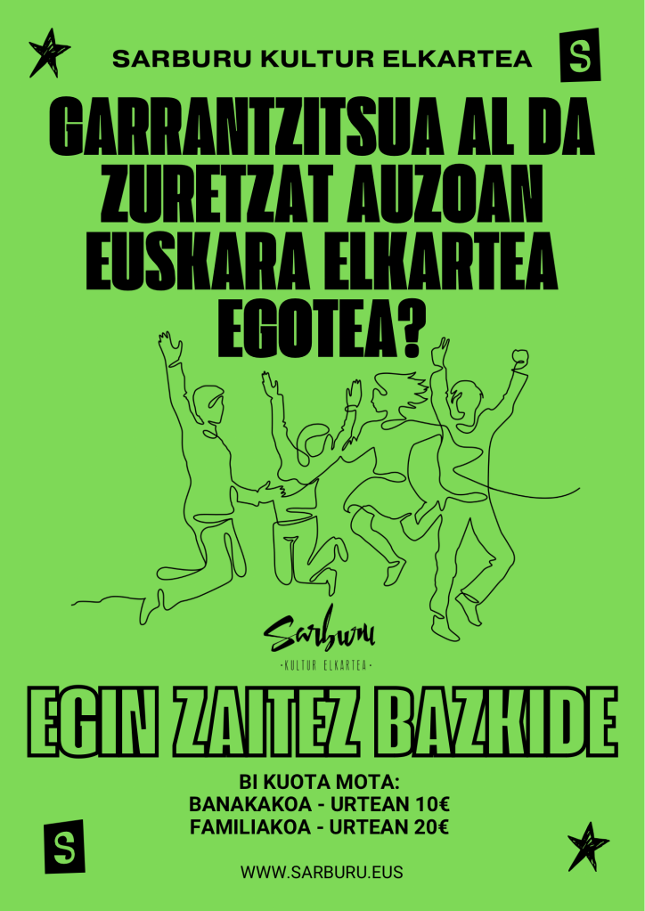 Sarburu Kultur Elkarteko kidea izan nahi? Eman izena formulario honen bidez! https://docs.google.com/forms/d/e/1FAIpQLSdsVdPe9tZ4v5Al9jSpTeXuppYZ50NkhgoWFKpjWakoLtGUPA/viewform